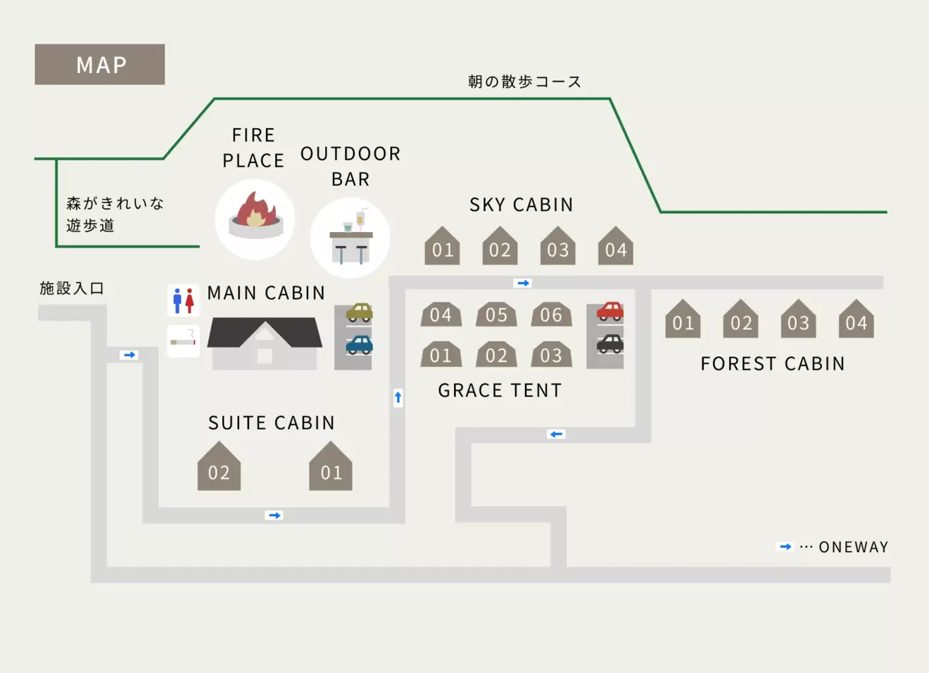 | 駐車場 | お車は指定のスペースに駐車ください。(当日、スタッフがご案内致します。)また、車両から離れる際は必ずエンジンをお切りください。 この森では、お客さまがゆったりと過ごしています。敷地内では、歩行者優先でお願いします。 施設内は一方通行です。虫や動物も共生していますので、案内看板に従い、10km/h以下で走行ください。 虫の音が聴こえる静かな夜をお楽しみいただく施設です。23時以降のお車での移動、外出は緊急時を除きご遠慮ください。 施設内でのお客さまによるお車のトラブル(事故・破損等)は、当施設は一切責任を負いかねます。 |