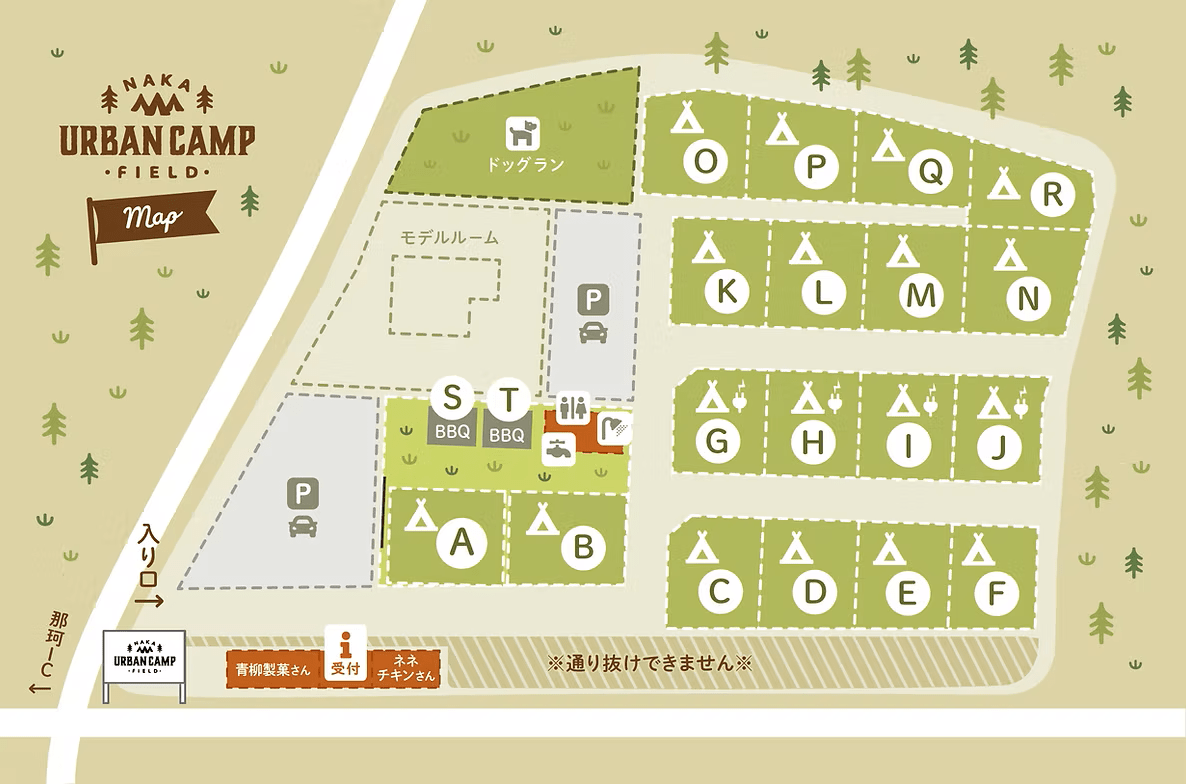 | 駐車場 | サイト内へ乗り入れ可能 ※複数台でお越しの場合は、共用駐車場にお停めください。(受付にて駐車許可書配布) |