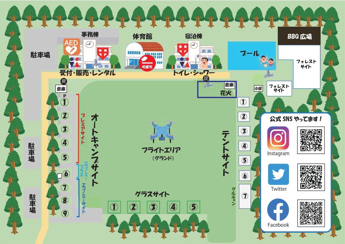 | 場内設備 | シャワー / 給湯 / AC電源 / Wi-Fi(管理棟・宿泊棟で使用可能) |