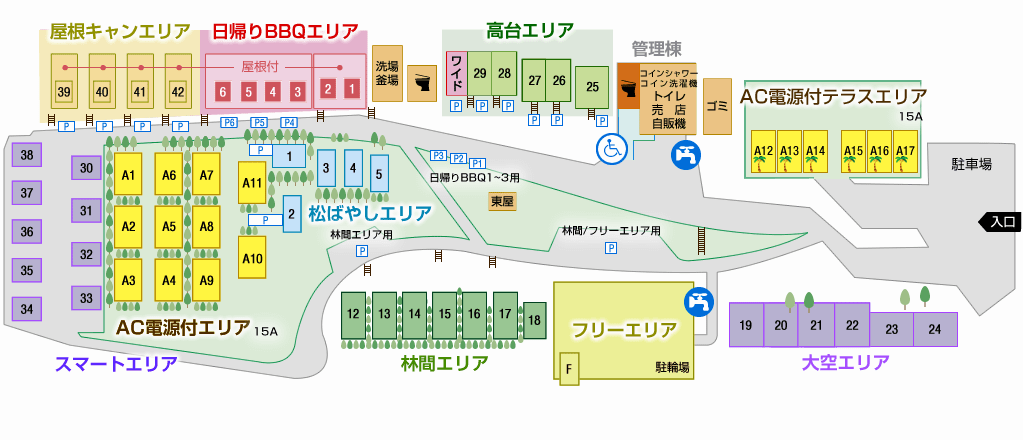 | その他設備 | シャワー / ゴミ捨て場 / ランドリー / ウォッシュレット式トイレ / 売店・自動販売機 / 炊事棟 / AC電源 / 給湯 / バリアフリー |