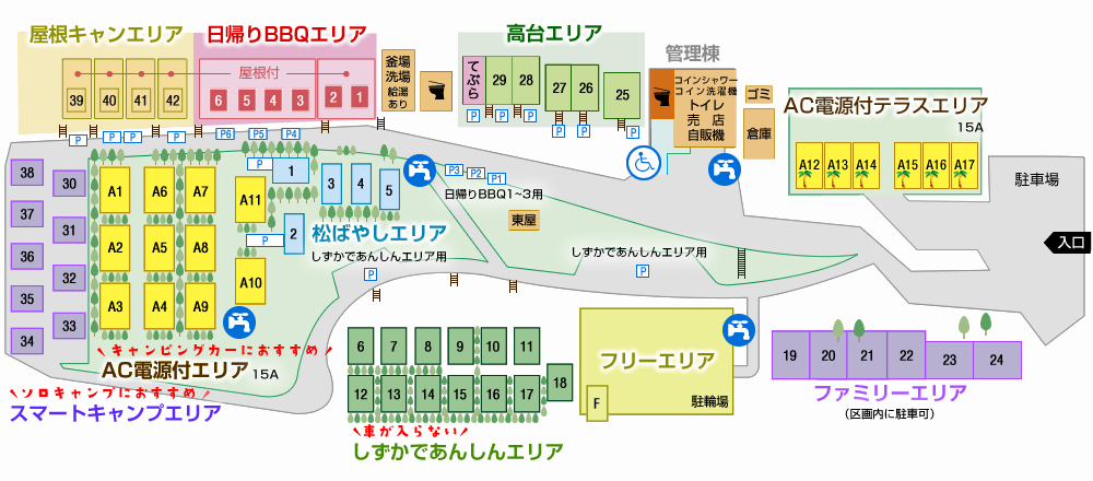 | 場内設備 | シャワー / ゴミ捨て場 / ランドリー / ウォッシュレット式トイレ / 売店・自動販売機 / 炊事棟 / AC電源 / 給湯 / バリアフリー |