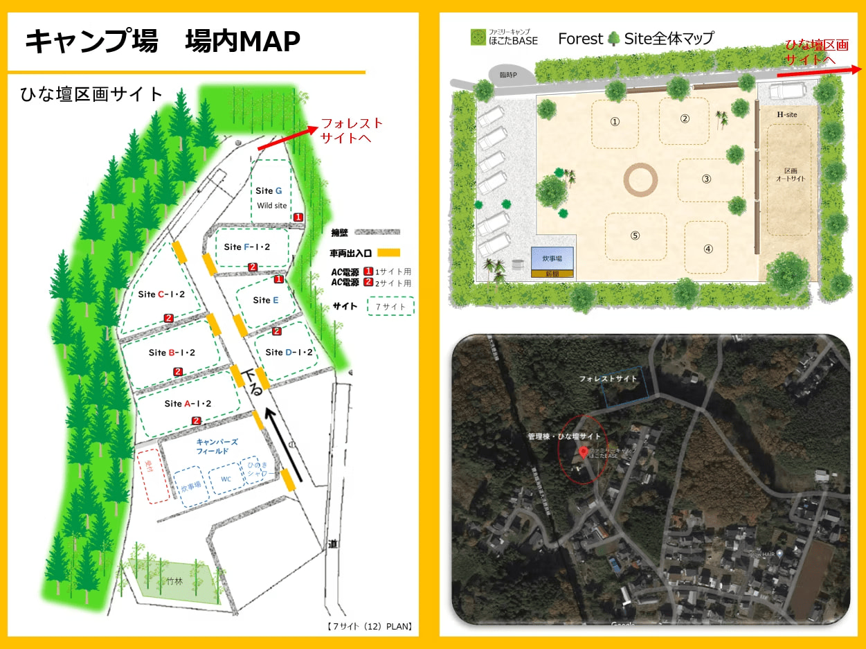 | 場内設備 | 洋式トイレ(水洗) ウォシュレット式 / 炊事棟(一部給湯) / シャワー棟 / AC電源サイト / 自動販売機 / ゴミ捨て場 |