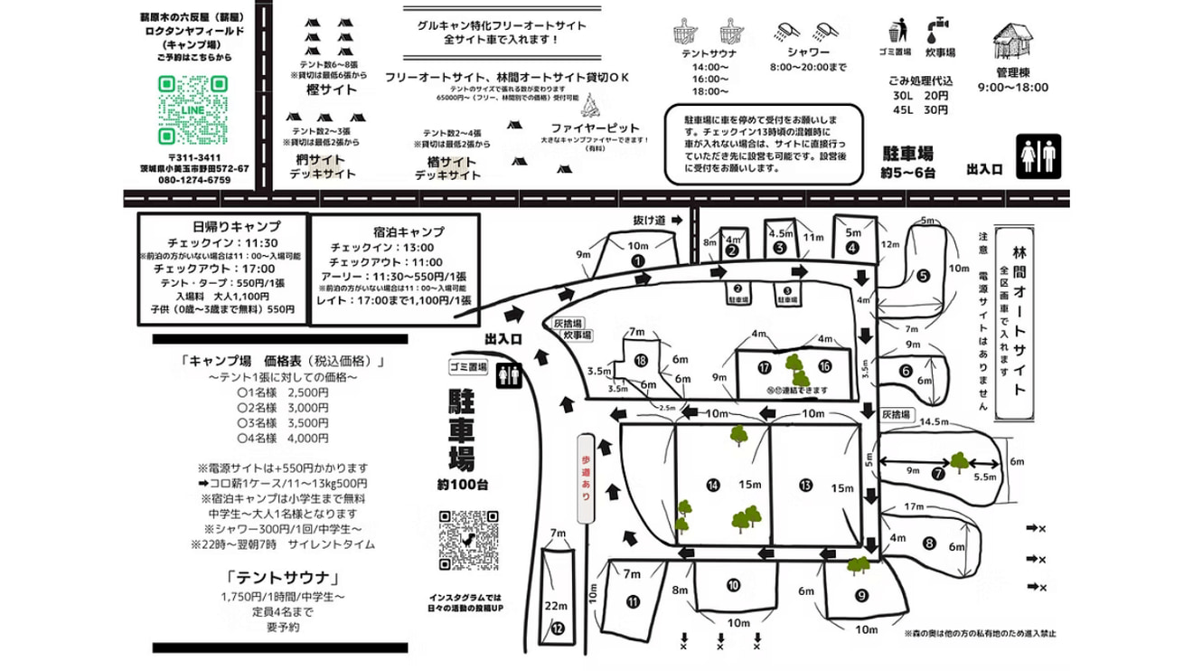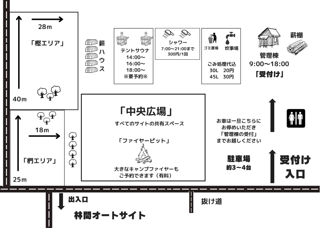 | 場内設備 | シャワー / ゴミ捨て場 / 洋式トイレ(水洗) / 炊事棟 / AC電源サイト |