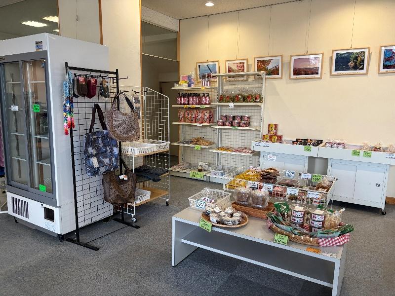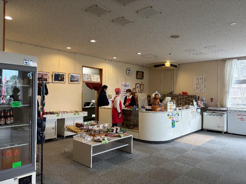 受付は隣接する温泉施設「竜っちゃんの湯」で行います。建物内には売店があり、地元特産品や薪なども購入できます。