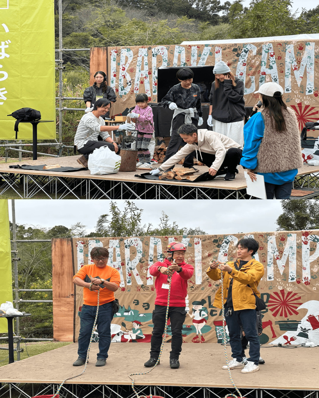 今年はお客様と一緒によりイベントを楽しむためステージを用意!茨城の地酒やソフトドリンクで乾杯をした後は、「じゅんいちダビッドソン」さんによる茨城県内キャンプ場やCAMP HACKきむ兄さんとのトークショー(25日のみ)、ツリークライミングを行う「TreeFrogOutdoor」によるロープワーク対決などなど、2日間にわたって様々なイベントを一緒に楽しみました。